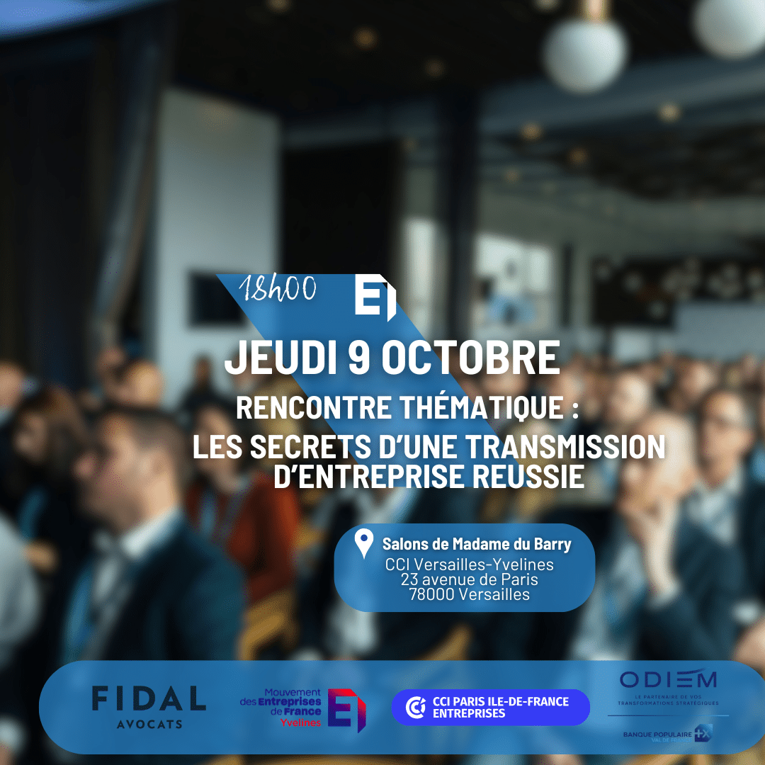 Le MEDEF Yvelines, en partenariat avec FIDAL, la Banque Populaire Val de France et la CCI Yvelines, organise une conférence sur la transmission d’entreprise le jeudi 9 octobre 2025 à 18h00, au Salon Madame du...
