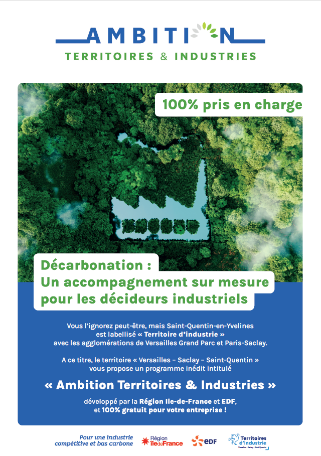 Labellisé « Territoire d’industrie », le secteur réunissant Saint-Quentin-en-Yvelines, Versailles Grand Parc et Paris-Saclay déploie le programme « Ambition Territoires & Industries » pour soutenir la transition écologique des acteurs économiques locaux.