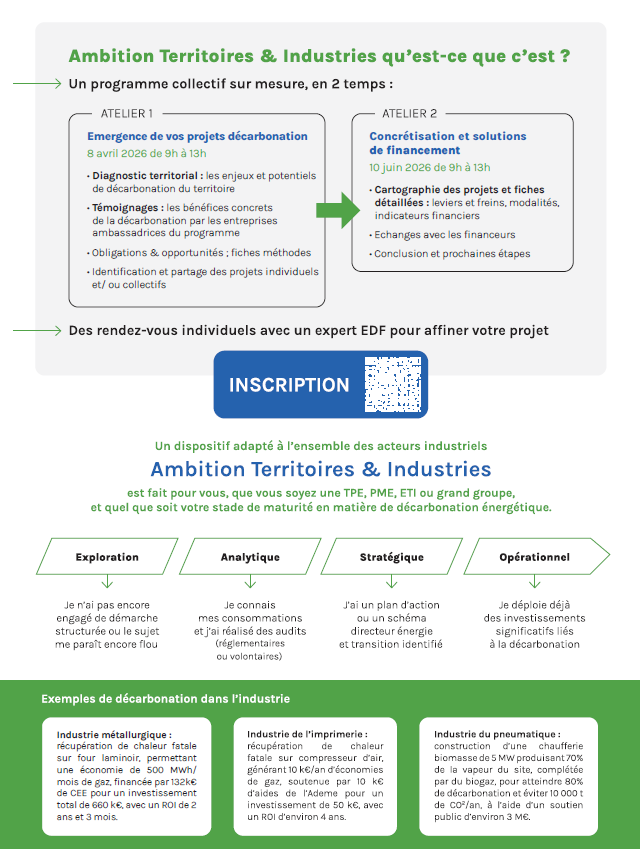 • Atelier 1 – 8 avril 2026 (9h à 13h) : Session dédiée au diagnostic territorial, aux retours d’expérience d’entreprises ambassadrices et à l’émergence de projets de décarbonation.