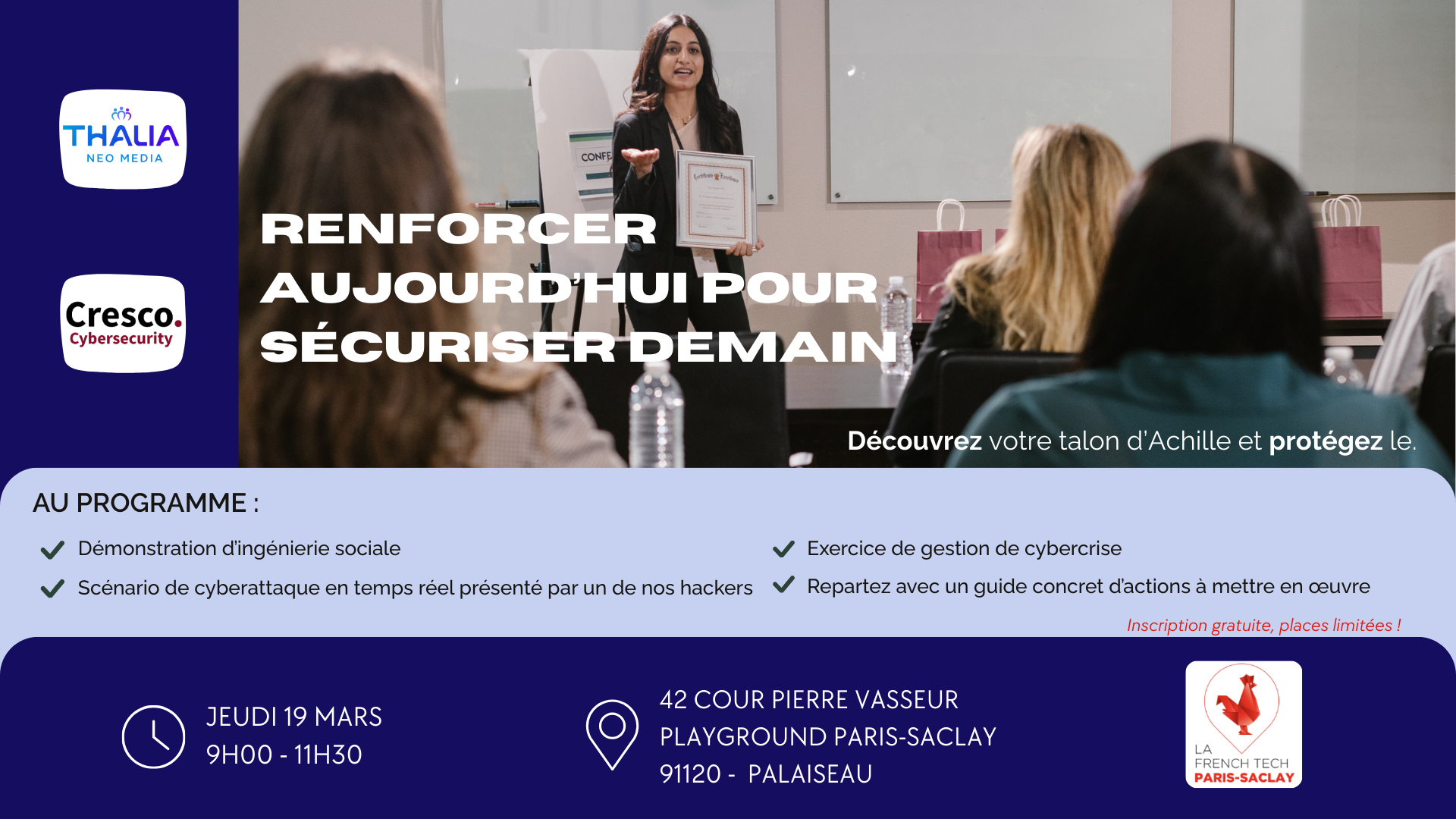 Arrivée des participants et introduction : 9h00 – 9h30 Acte 1 – Démonstration d’ingénierie sociale (Cresco) : 9h40 – 10h20 Acte 2 – Stress Test Cybercrise (Thalia Neomedia) : 10h20 – 11h00 Conclusion et échanges : 11h00 – 11h30 Fin prévue de l’événement : 11h30